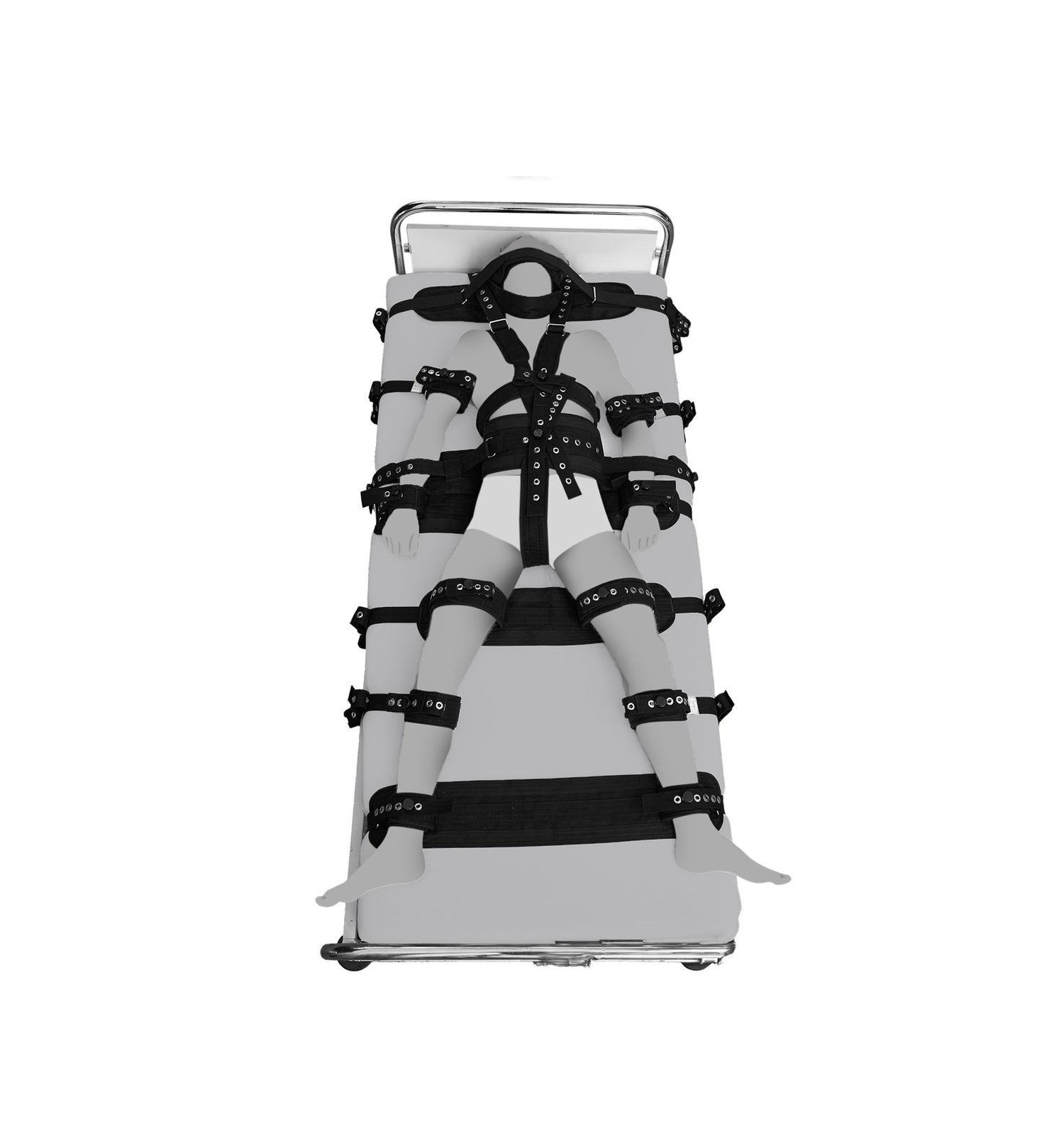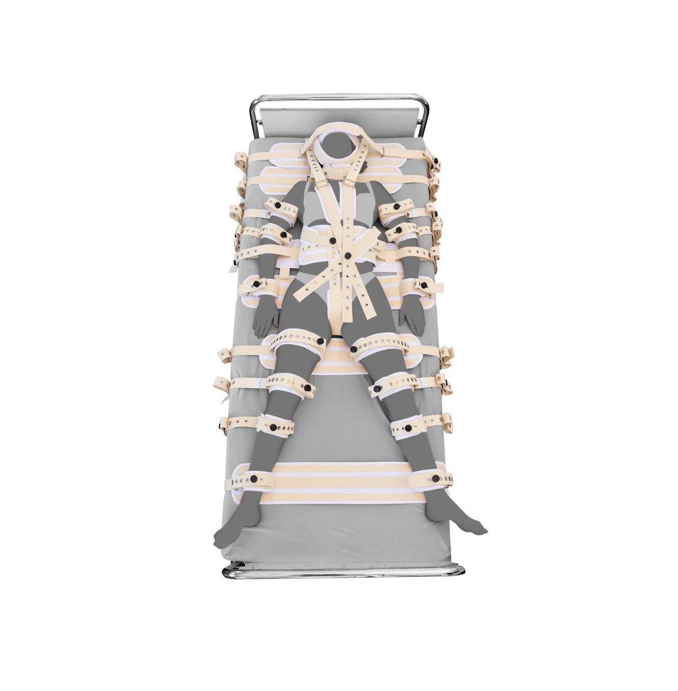 Psychiatrische Fixierungen folgen klaren, professionellen Standards: Der Körper wird am Bett so stabil gesichert, dass unkontrollierte Bewegungen effektiv reduziert werden. Typisch sind breite Fixiergurte über Brust, Bauch, Becken, Armen und Beinen, eine vollständige Bettfixierung, wie man sie aus klinischen Einrichtungen kennt. Zusätzlich kommen Schrittgurte zum Einsatz, die die Hüfte fixieren, sowie Schultergurte, die den Oberkörper zuverlässig stabilisieren und jedes Verdrehen verhindern.